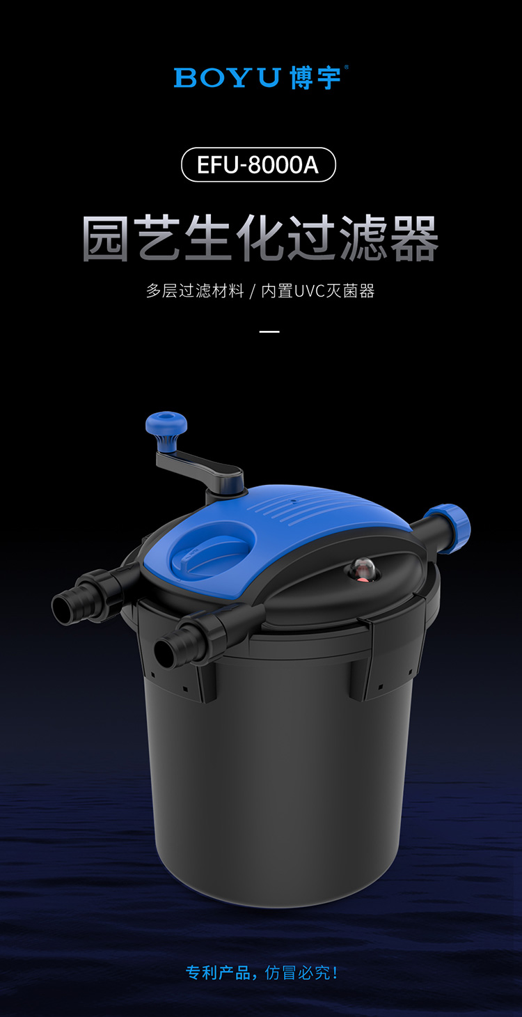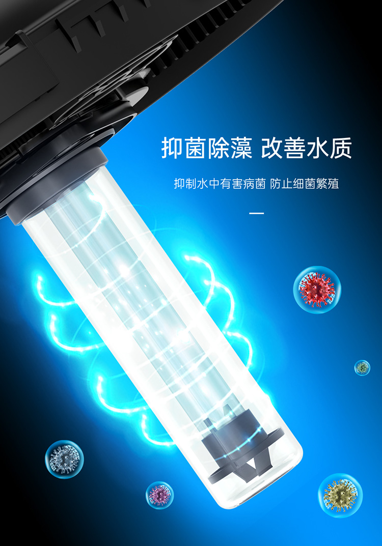 內(nèi)置式紫外線燈,能有效地殺死水中的藻類、病毒及有害菌;