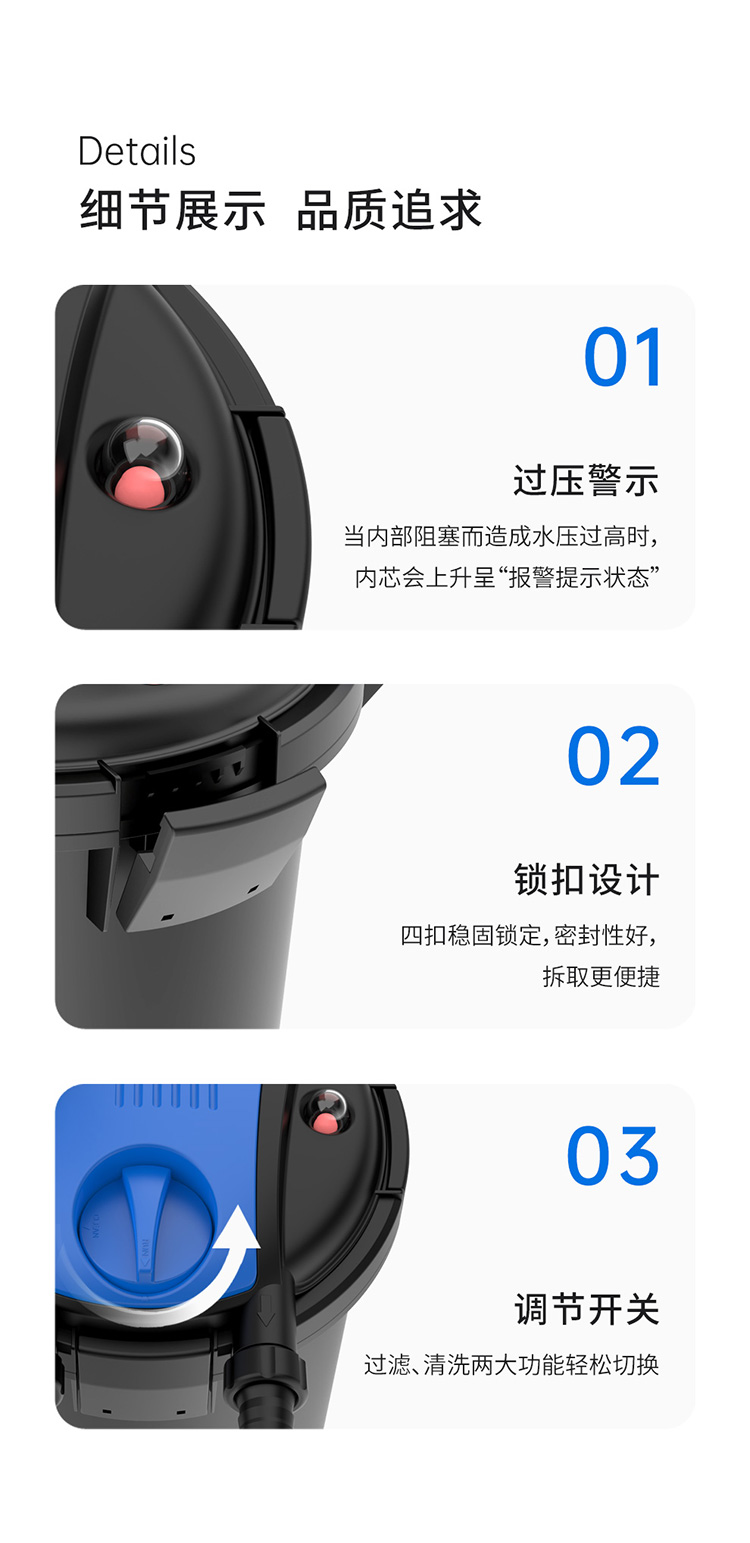 免拆洗設(shè)計,手搖擠壓清潔機(jī)構(gòu),能將生化棉中的污物擠壓脫落,反沖洗水流將污物排除,維護(hù)更方便;